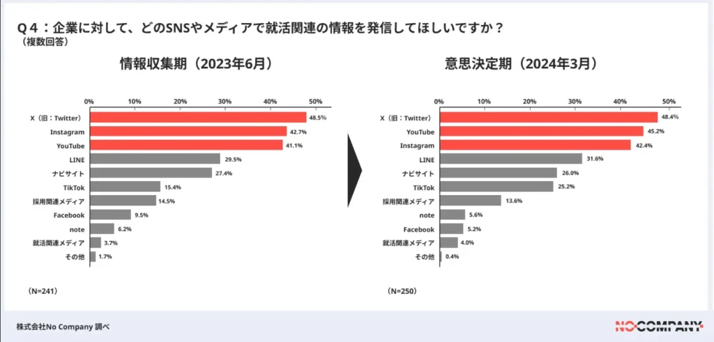 株式会社No Companyの調査では、情報収集期・意思決定期のいずれも 48%以上がXを希望。