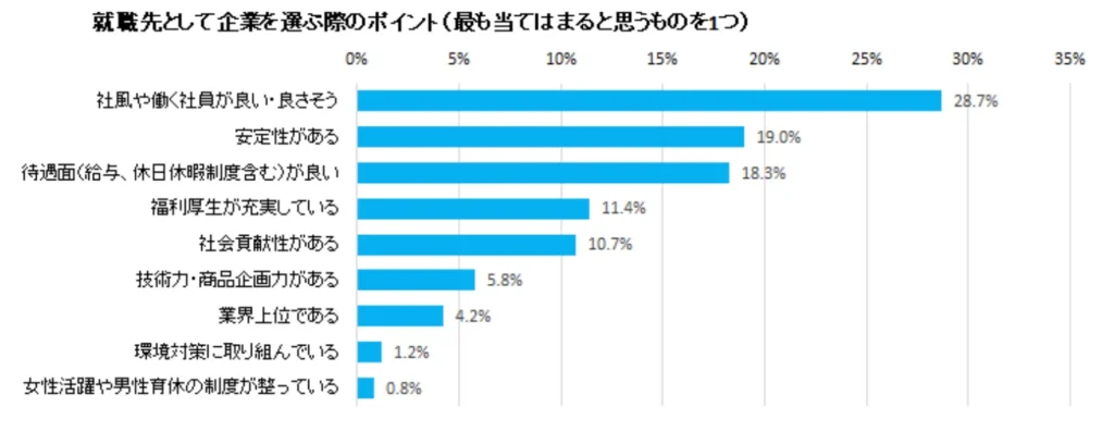 マイナビの調査によると、「就職先として最も重視するポイント」として最も多かったのは「社風や働く社員が良さそう」で、「安定性がある」や「待遇が良い」といった理由を上回る結果となりました。